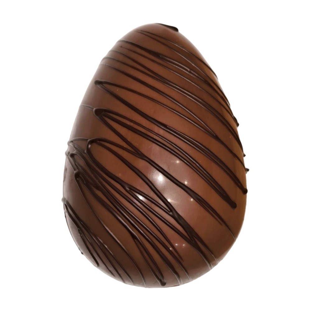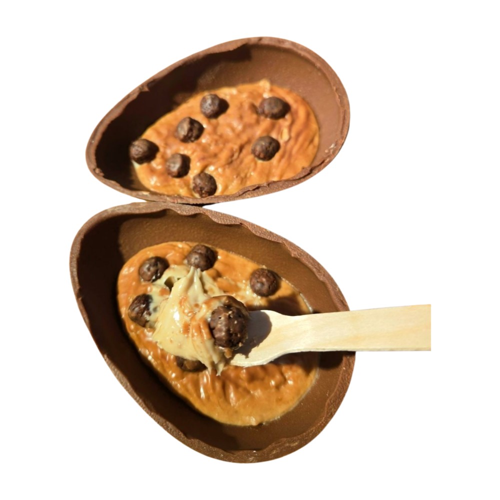 Un oeuf avec dans les deux coques une petite garniture gourmande à base de crème bueno, de feuilletine et de céréales chocolatées.