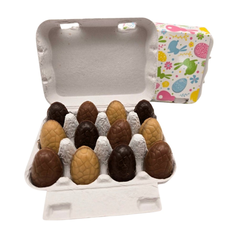 Découvrez le plaisir croustifondant de ces mini œufs pralinés de Pâques présentés dans une jolie boite cartonnée. Déclinés dans leurs enrobages chocolat lait praliné feuilletine, chocolat noir praliné à l'ancienne et chocolat blond praliné spéculoos. 12 pièces.
