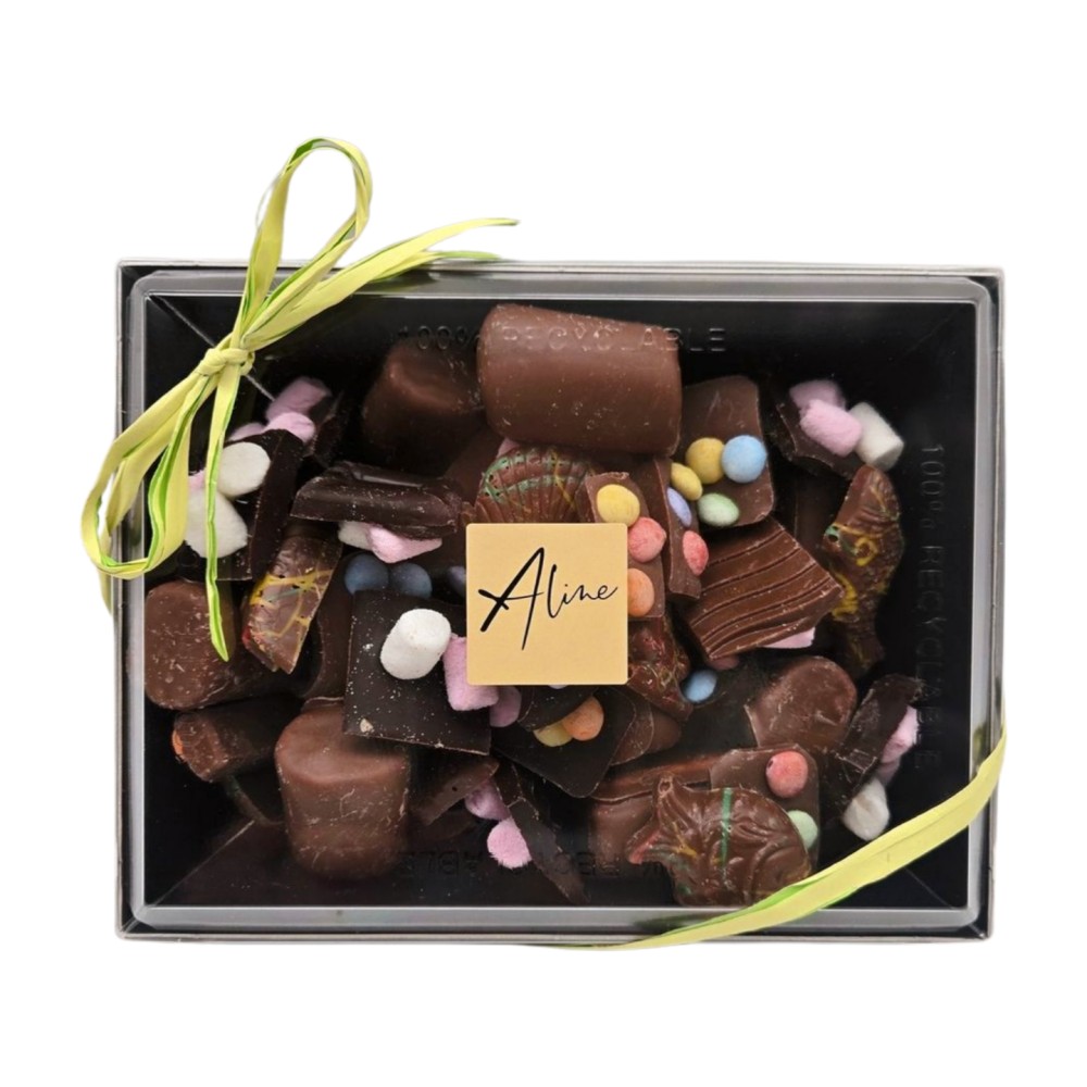 Ingrédients: chocolat lait (beurre de cacao, LAIT entier, sucre, émulsifiant : lécithine de SOJA, arôme naturel de vanille) et noir, guimauve (sirop de glucose, fructose, sucre, eau, dextrose, gélatine de porc, arôme naturel, colorant: acide carminique), smarties (farine de riz, sirop de glucose, E414, E322, E903, E901, E904, colorants alimentaires), colorants naturels alimentaires. Poids: 300g