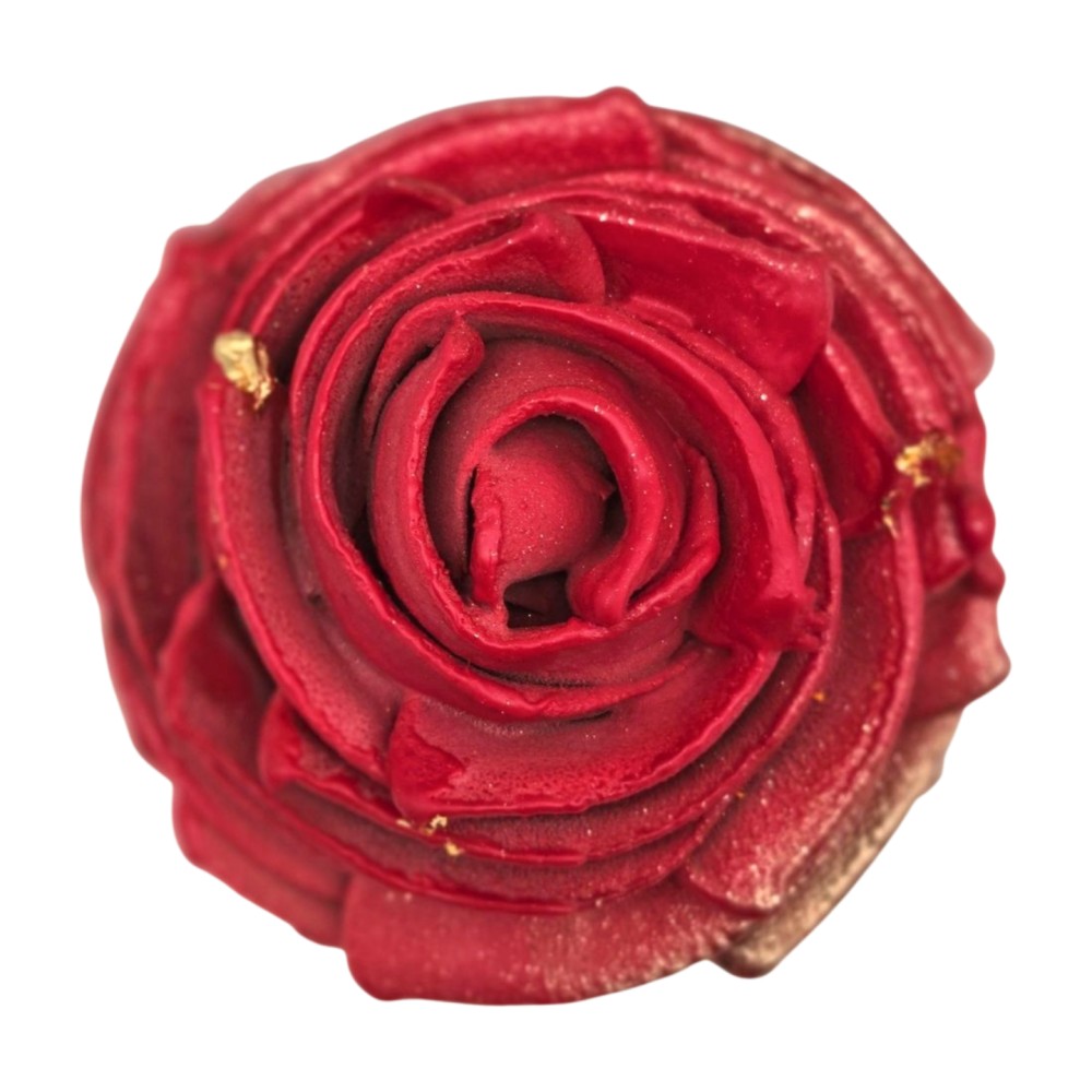 Une coque chocolat aux amandes surmontée de gianduja au lait pour former cette magnifique rose.